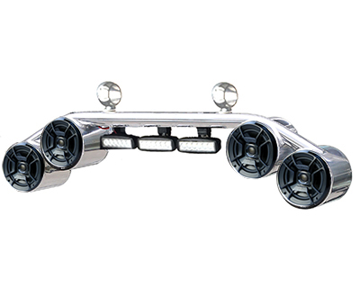 Reborn wakeboard tower speaker and light bar combo is manufactured with polished 6061 aluminum and is pre wired fro easy installation. We have installed 4 high quality water proof speakers, and 3 x 6 watt LED lights, and the sounds will satisfy you as well as those known brands in speaker industry.
